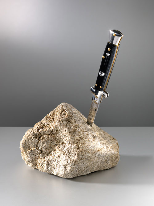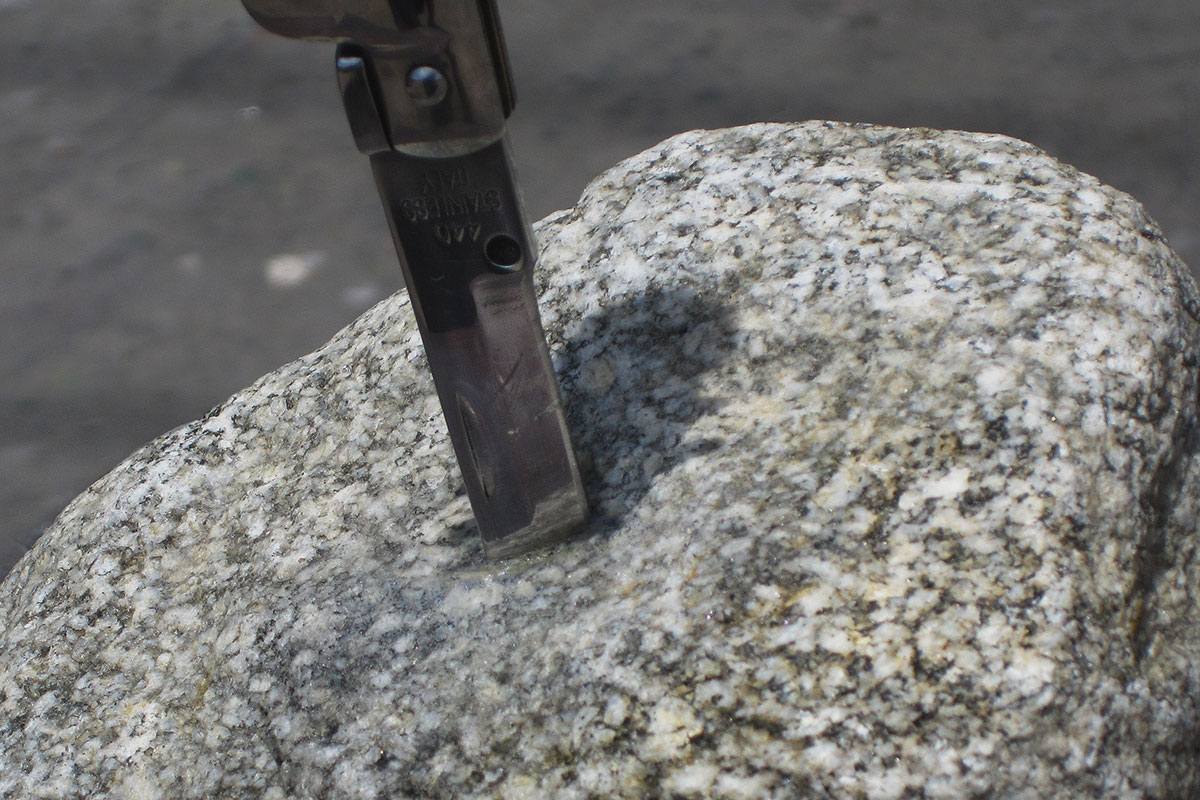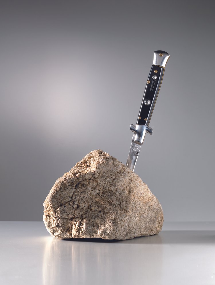 Knife with metal blade in stone, approx. 6 ¾ x 4 ¾ x 10 ½”, 7 lb (ca. 17 x 12 x 26,5 cm, 3 kg.)